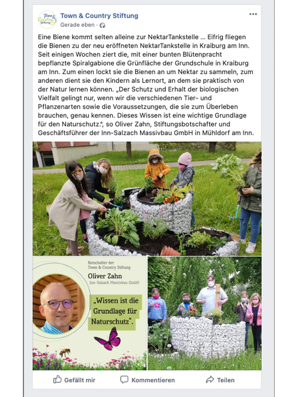 Eifrig fliegen die Bienen zu der neu eröffneten NektarTankstelle in Kraiburg am Inn. Seit einigen Wochen ziert die, mit einer bunten Blütenpracht bepflanzte Spiralgabione die Grünfläche der Grundschule in Kraiburg am Inn. Zum einen lockt sie die Bienen an um Nektar zu sammeln, zum anderen dient sie den Kindern als Lernort, an dem sie praktisch von der Natur lernen können.